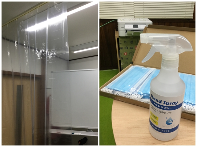 当教室でもビニールカーテンを使った飛沫防止、マスク・消毒液などの感染予防策をとっているので、