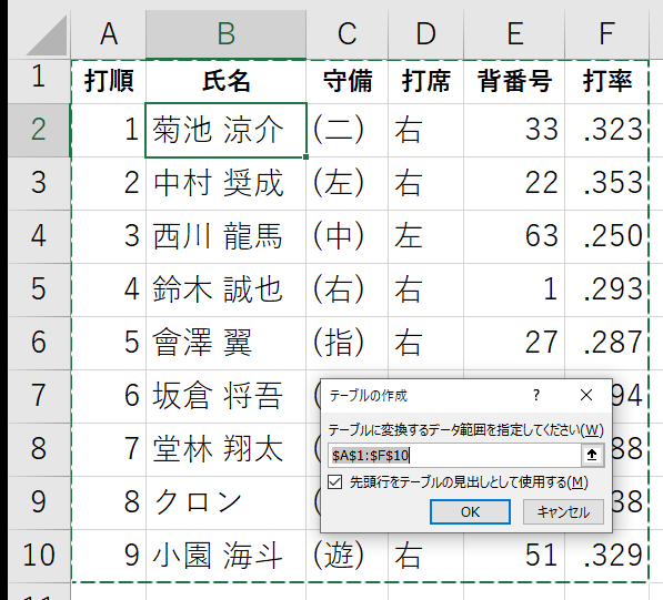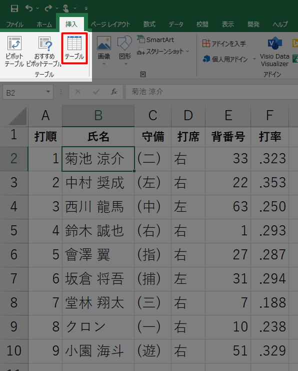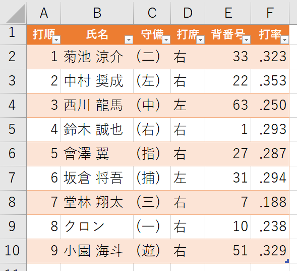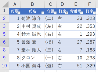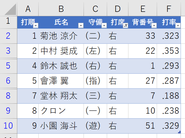 ↑フィルターを使い、「打席」が「右」の選手だけを抽出してみました。