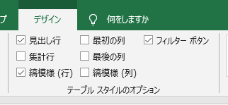 [デザイン(テーブルツール)]タブ→「テーブルスタイルのオプション」グループで、