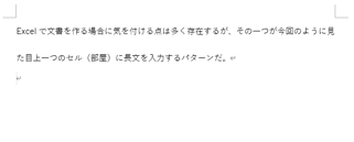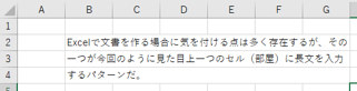 一見二つとも同じように見えますが、左は列幅を広げ文字列を折り返しする設定にしたうえで一つのセルに文字列を入力し、右はセルを横方向に結合して入るだけ文字列を入力しています。